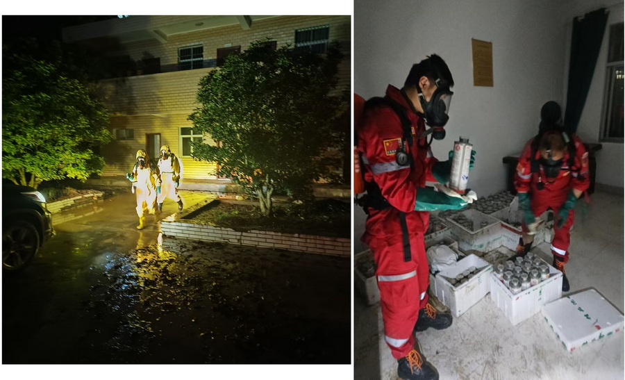 海利集團(tuán)救援隊于19日20時抵達(dá)現(xiàn)場后,全體隊員未作休整即刻投入救援。在快速完成化學(xué)防護(hù)服穿戴及空氣呼吸器佩戴的同時,同步核查糧庫物資存儲信息。完成準(zhǔn)備工作后,救援組立即進(jìn)入倉庫展開分工協(xié)作,對庫區(qū)空氣實施系統(tǒng)化檢測與偵查。經(jīng)全面排查潛在風(fēng)險點,確認(rèn)除磷化鋁瓶體表面存在大量淤泥附著外,其包裝內(nèi)部未發(fā)現(xiàn)進(jìn)水跡象。