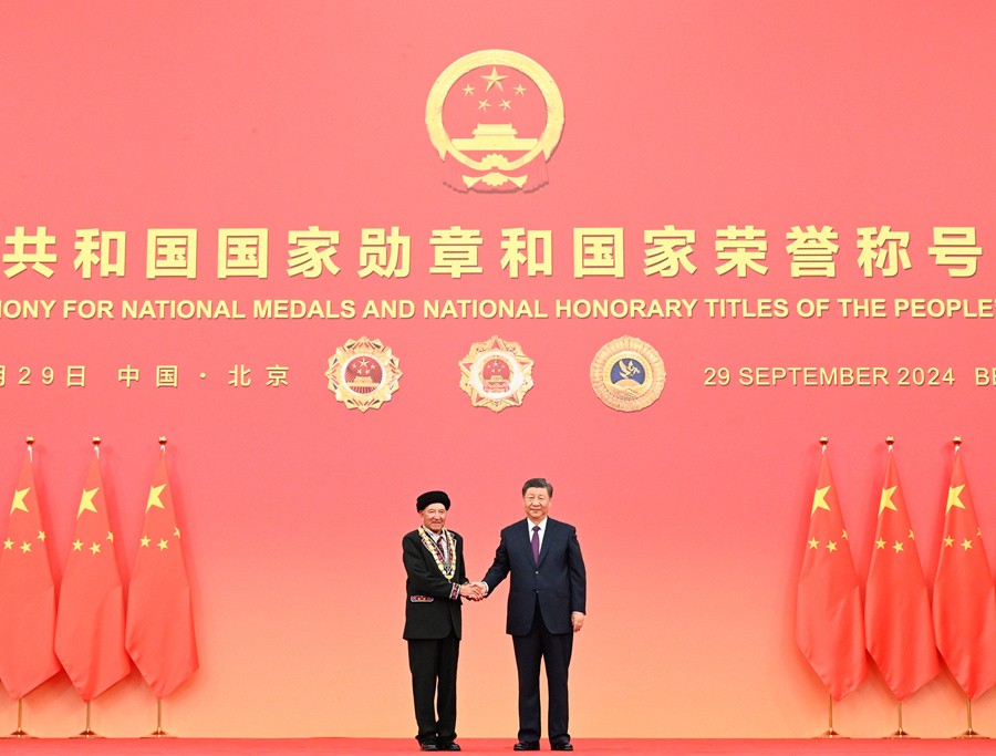 9月29日,中華人民共和國國家勛章和國家榮譽(yù)稱號頒授儀式在北京人民大會堂金色大廳隆重舉行。中共中央總書記、國家主席、中央軍委主席習(xí)近平向“人民衛(wèi)士”國家榮譽(yù)稱號獲得者巴依卡·凱力迪別克頒授獎?wù)隆P氯A社記者鞠鵬攝