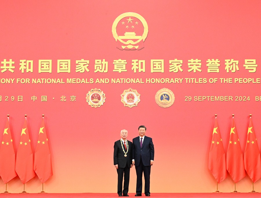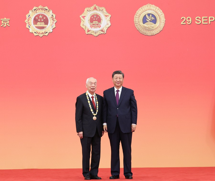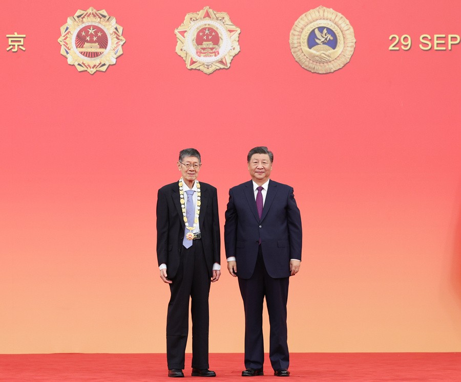 9月29日,中華人民共和國國家勛章和國家榮譽(yù)稱號頒授儀式在北京人民大會堂金色大廳隆重舉行。中共中央總書記、國家主席、中央軍委主席習(xí)近平向“人民科學(xué)家”國家榮譽(yù)稱號獲得者趙忠賢頒授獎?wù)隆P氯A社記者鞠鵬攝