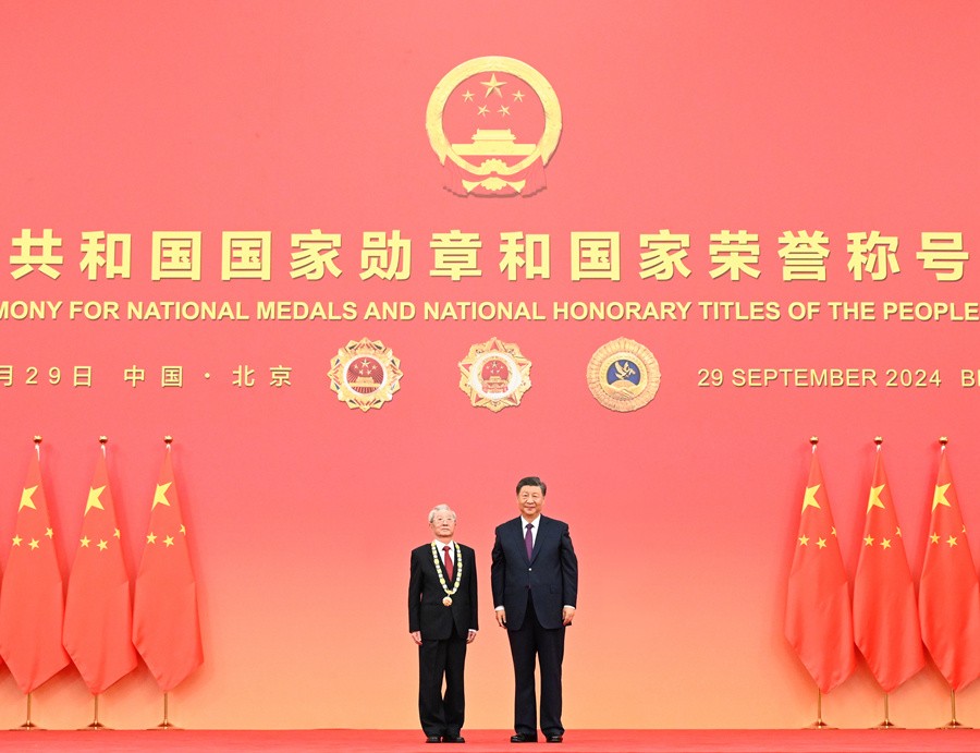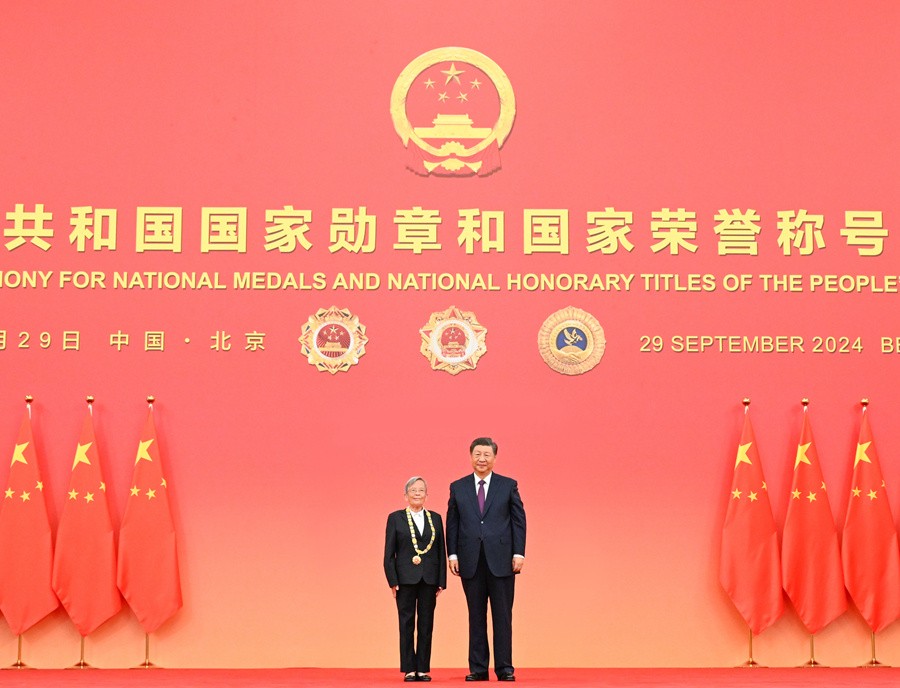9月29日,中華人民共和國國家勛章和國家榮譽(yù)稱號頒授儀式在北京人民大會堂金色大廳隆重舉行。中共中央總書記、國家主席、中央軍委主席習(xí)近平向“人民科學(xué)家”國家榮譽(yù)稱號獲得者趙忠賢頒授獎?wù)?。新華社記者謝環(huán)馳攝