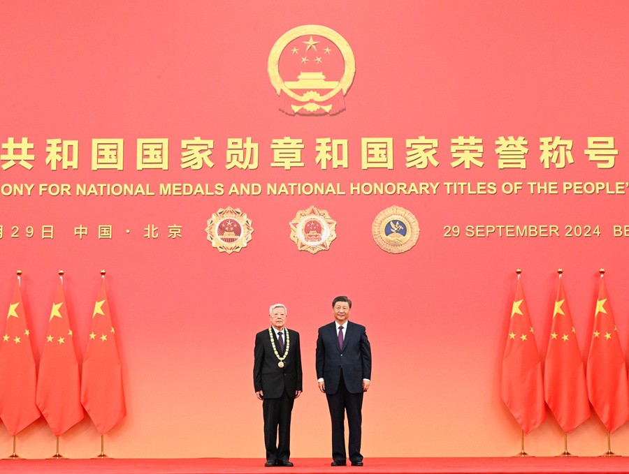 9月29日,中華人民共和國國家勛章和國家榮譽(yù)稱號頒授儀式在北京人民大會堂金色大廳隆重舉行。中共中央總書記、國家主席、中央軍委主席習(xí)近平向“共和國勛章”獲得者黃宗德頒授勛章。新華社記者鞠鵬攝