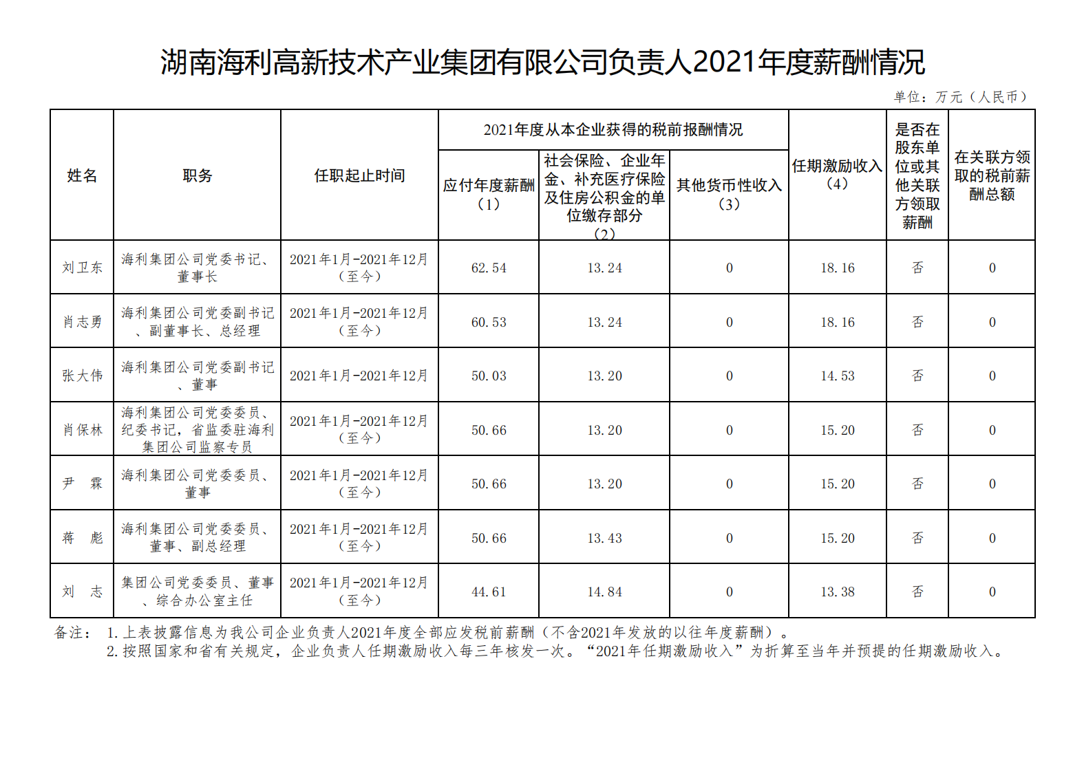湖南海利高新技術(shù)產(chǎn)業(yè)集團有限公司負責人2021年度薪酬情況